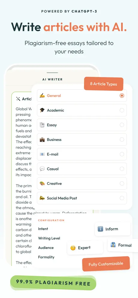 When you select article domain as "Essay", you can configure your essay intent, audience, formality and writing level.